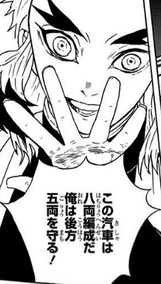 鬼滅の刃60話にて、杏寿郎が炭治郎に放ったセリフ。「八両中五両を守る」と宣言する杏寿郎。一発で柱の格の違いをわからせてくれる描写である。