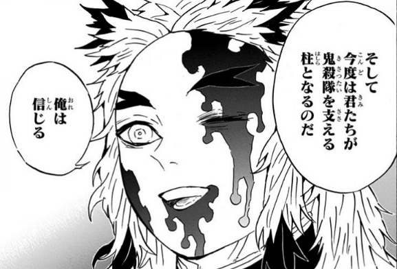 無い。俺はもうすぐに死ぬ。喋れるうちに喋ってしまうから聞いてくれ。弟の千寿郎には自分の心のまま正しいと思う道を進むよう伝えて欲しい、父には体を大切にして欲しいと。それから竈門少年、俺は君の妹を信じる。鬼殺隊の一員として認める。汽車の中であの少女が血を流しながら人間を守るのを見た。命をかけて鬼と戦い人を守る者は、誰が何と言おうと鬼殺隊の一員だ。胸を張って生きろ。己の弱さや不甲斐なさにどれだけ打ちのめされようと心を燃やせ、歯を喰いしばって前を向け。君が足を止めて蹲っても時間の流れは止まってくれない。共に寄り添って悲しんではくれない。俺がここで死ぬことは気にするな。柱ならば後輩の盾となるのは当然だ。柱ならば誰であっても同じことをする。若い芽は摘ませない。竈門少年、猪頭少年、黄色い少年、もっともっと成長しろ。