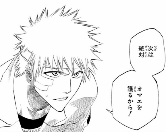 ブリーチ196話にて、織姫に謝っていく一護のセリフ。「次は絶対に護る」と誓っていく一護。いつもの一護に戻った瞬間である。