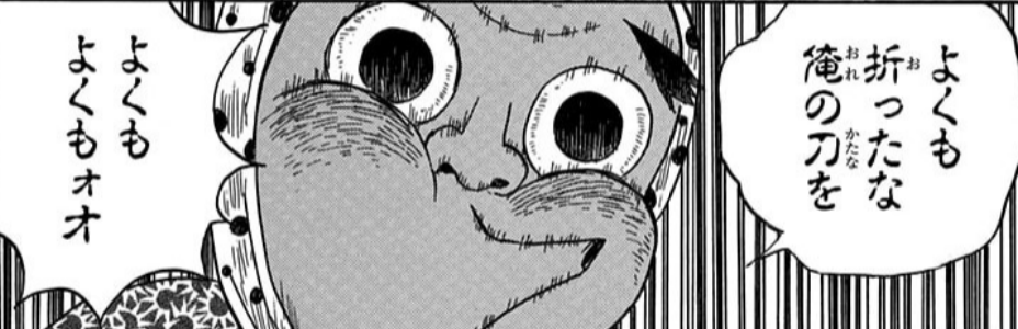 よくも折ったな俺の刀を、よくもよくもォオ鬼滅の刃51話にて、炭治郎の前に現れた鋼鐵塚が放ったセリフ。挨拶代わりに包丁をブッ刺そうとしていく鋼鐵塚。クレイジーすぎてオモロい。