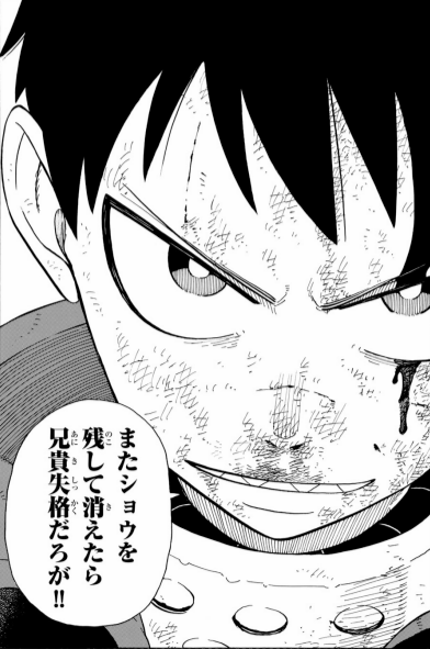 炎炎ノ消防隊83話にて、「今度こそ戻ってこれなくなるよ」と言うリヒトにシンラが返したセリフ。「ショウを一人にしない」というシンラの意志が伝わってくるシーン。ショウへの愛が半端ないですね。