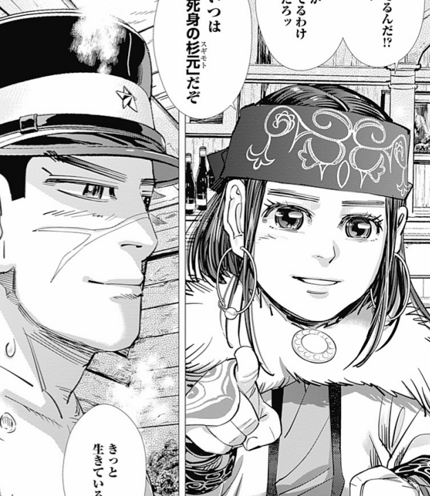 ゴールデンカムイ147話にて、「俺はあんな野郎が簡単に死ぬとは思えないんだよ」と言う杉元にアシㇼパが返したセリフ。「不死身の杉元」を信じていくアシㇼパ。アシㇼパが杉本を絶対的に信頼してることが伝わるシーン。