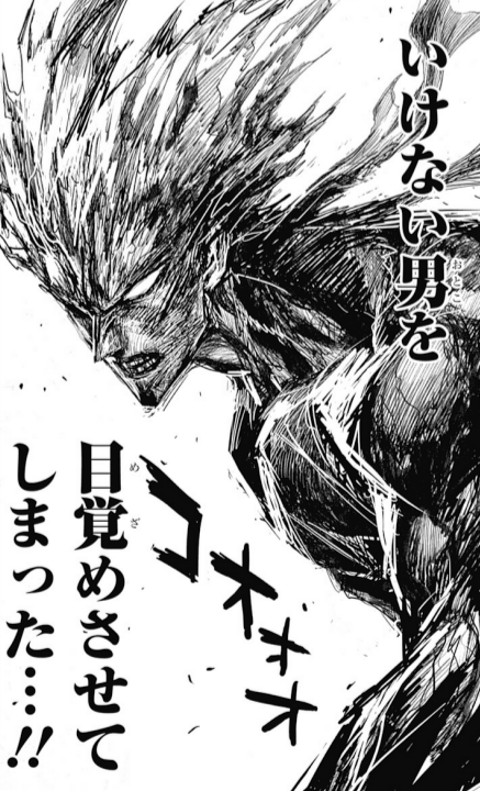 ワンパンマン119話にて、目覚めたガロウを見たぷりぷりプリズナーのセリフ。ガロウの覚醒。画がかっこよすぎる。