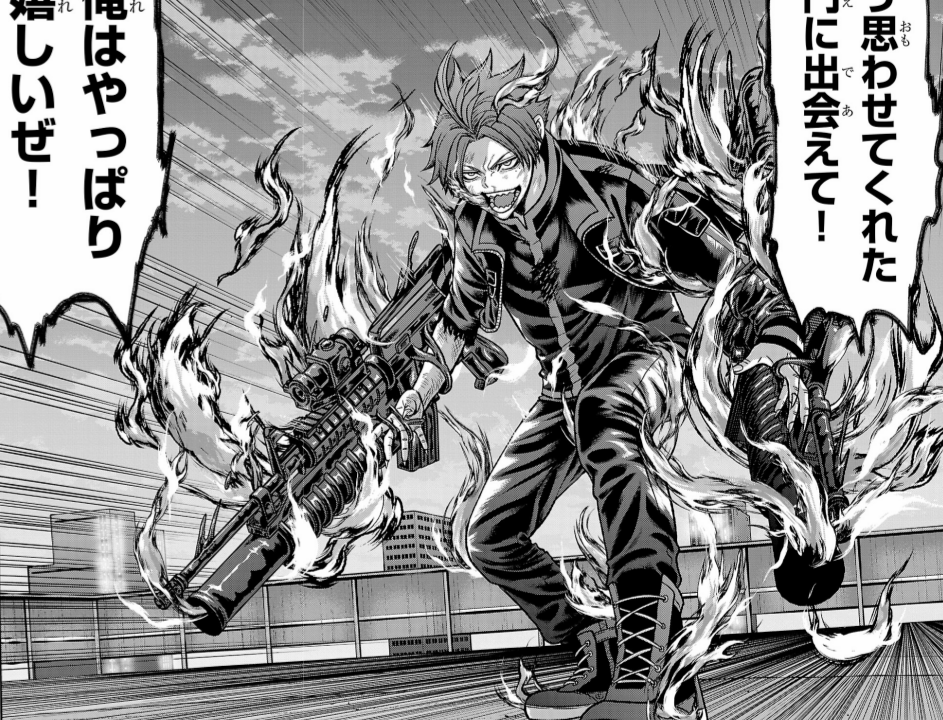 桃源暗鬼68話にて、2丁の銃を作り出した四季のセリフ。炎鬼の力に銃まで2丁作り出していく四季。主人公の覚醒シーンは最高や。