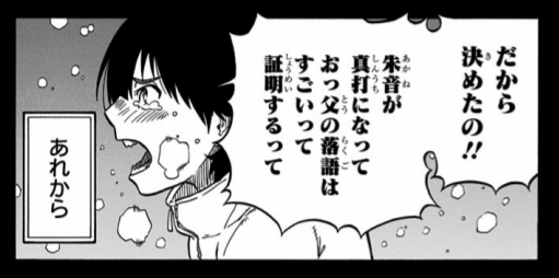 ・・・みんなから言われる、よかったねって。おっ父が落語をやめてやめさせられてよかったね・・・って。朱音はおっ父の落語が好きだった。一人で喋ってるだけなのに、聞いてたら色んな人や景色が見えて魔法みたいで。だから、おっ父が落語をやめた時、もう見れないのかって悲しくて。でも、みんなはっ、おっ父が落語をやめた時、マジメになったって、みんなニコニコ笑ってて、悲しんでるのは朱音だけでっ、よかったねって言われるたび、好きだったおっ父の落語がダメだって言われてるみたいで嫌でっ・・・悔しくて。
