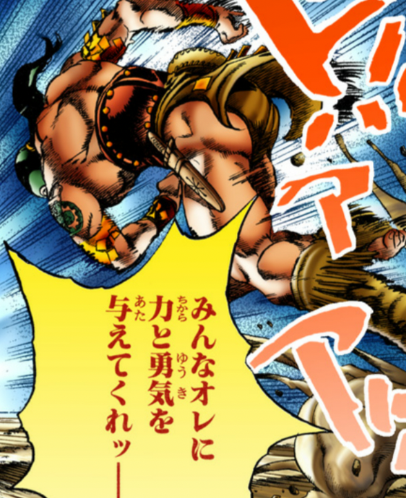 スティール・ボール・ラン11話にて、ゴール直前で4騎に追われるサンドマンのセリフ。サンドマンが故郷の皆の存在を力に変えようとしていくシーン。ジョジョらしいぜ。
