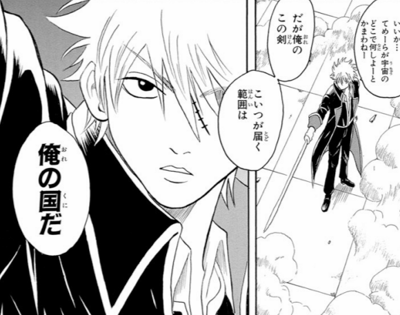 銀魂14話にて、「今に宇宙中に散らばる〝春雨〟がてめーらを殺しにくるだろう」と言う春雨団員に銀時が返したセリフ。自分の届く範囲は全力で護りにいく銀時。それがどれだけでかい相手でも一切怯まないのが銀さんらしい。