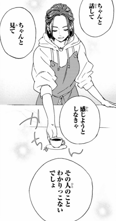 ウィンドブレイカー2話にて、コーヒーの実の色を答えた遥にことはが伝えたセリフ。人との関わり合いにおいて大事なことを伝えていくことは。精神年齢高すぎるだろw