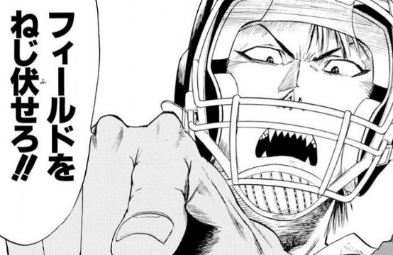 アイシールド214話にて、試合前の掛け声をかますヒル魔のセリフ。「デビルバッツと言えば」というシーン。ヒル魔らしい掛け声で最高。