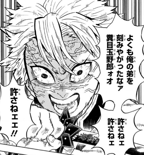 不死川実弥の名言・名シーン・名セリフ3選よくも俺の弟を刻みやがったなァ、糞目玉野郎ォオ、許さねェ許さねェ、許さねェェ!!