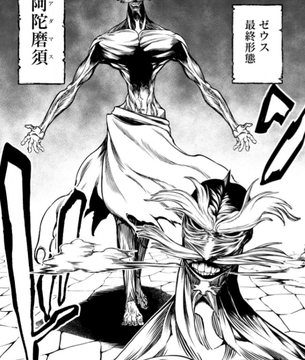 終末のワルキューレ11話にて、ゼウスが阿陀磨須となった際のナレーション。ゼウス最終形態。最強キャラの形態変化は熱すぎる。
