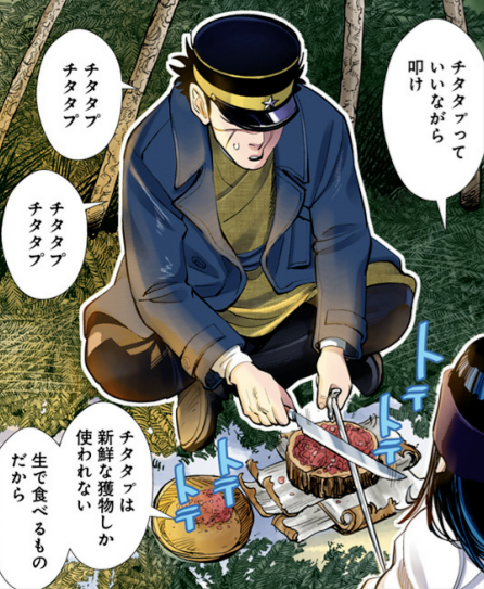 ゴールデンカムイ5話にて、杉元にチタタプさせる際のアシㇼパのセリフ。ゴールデンカムイと言えばチタタプ。初チタタプシーンです。
