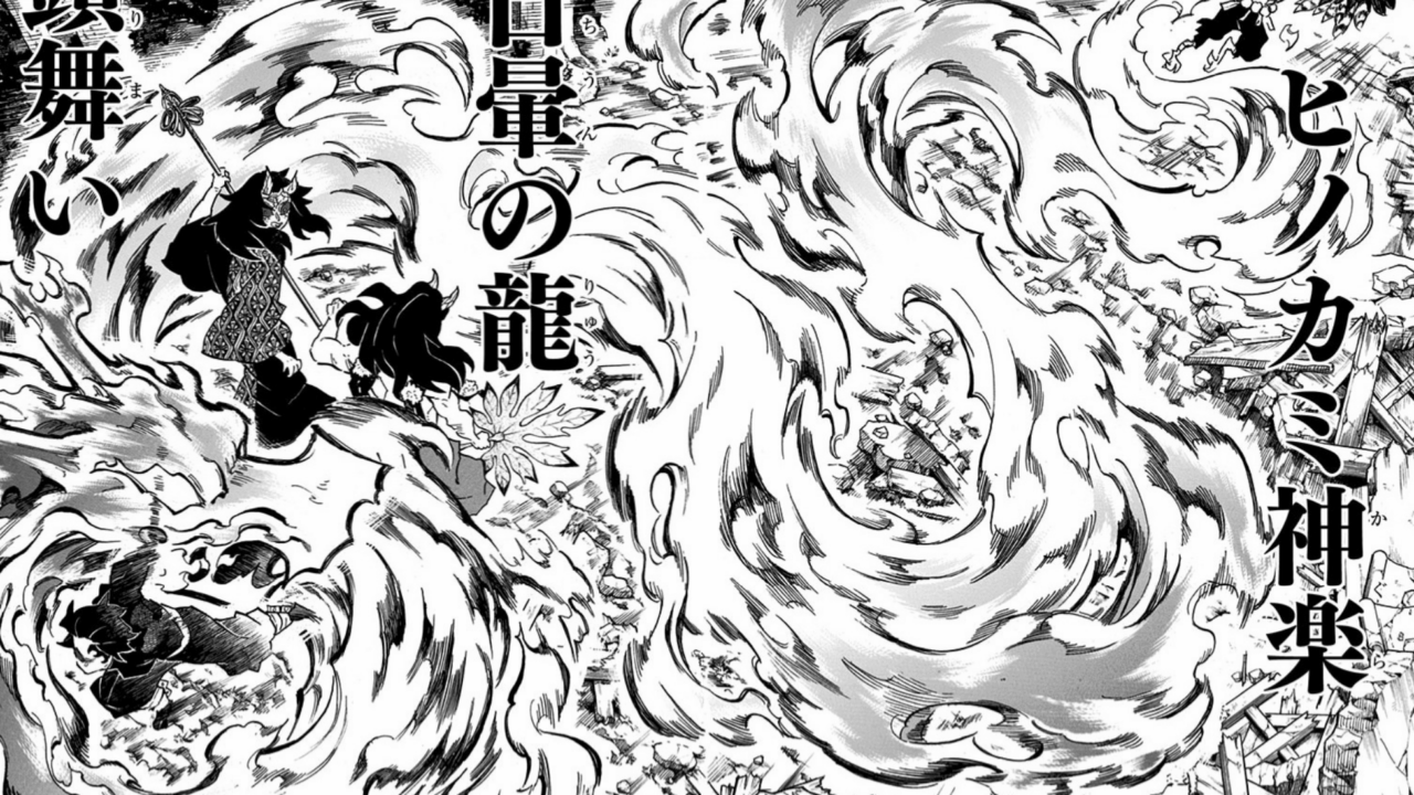 鬼滅の刃113話にて、炭治郎がヒノカミ神楽 日暈の龍頭舞いを放ったシーン。炭治郎と縁壱が重なった瞬間。炭治郎の成長っぷりがうかがえる。