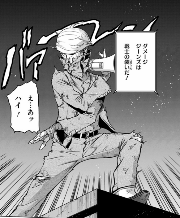 心配は無用、ダメージジーンズは戦士の装い(スタイル)だ!【ヴィジランテ】ヴィジランテ121話にて、「あなたは大丈夫ですか」と言われたジーニストのセリフ。ボロボロの姿を「ダメージジーンズ」と返していくジーニスト...