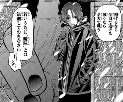 桃源暗鬼50話にて、颯に家族を殺された際の皇后崎のセリフ。皇后崎のオリジン。父親への復讐のために彼は生きていたことがわかる。