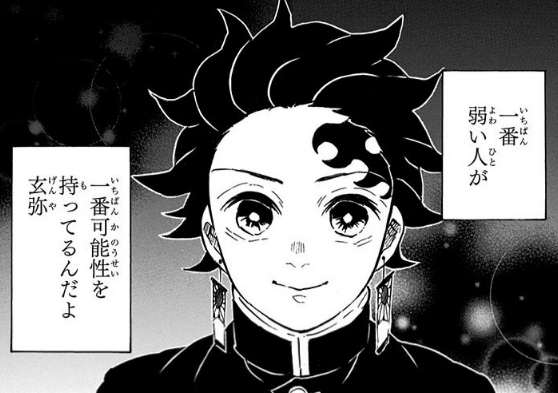 鬼滅の刃172話にて、炭治郎が玄弥に伝えたセリフ。弱い人の可能性を語る炭治郎。確かに上弦の陸戦はまさに炭治郎はその働きをしていましたね。