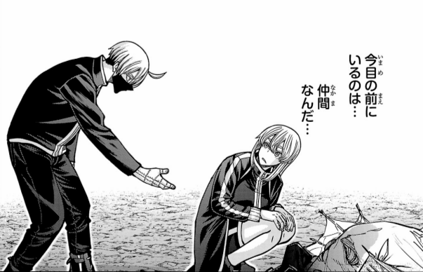 桃源暗鬼155話にて、皇后崎に「そんな凄い奴に頼ってもらえたら俺は嬉しいぜ?」と言われた際の屏風ヶ浦のセリフ。「仲間に頼る」も信頼と捉える屏風ヶ浦。この章、みんな成長しすぎだろ。