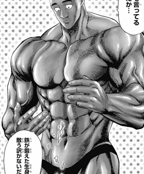 ワンパンマン79話にて、「馬鹿な、これ生身だよな」と言うデストロクロリディウムにクロビカリが返したセリフ。生身で鉄を凌駕する強度を誇る肉体を披露するクロビカリ。S級はイカれてる。