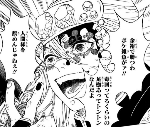 こいつらは三人共優秀な俺の〝継子〟だ。逃げねぇ根性がある。手足が千切れても喰らいつくぜ!!そして、テメェらの倒し方はすでに俺が看破した。同時に頚を斬ることだ。二人同時にな、そうだろ!!そうじゃなけりゃそれぞれに能力を分散させて、弱い妹を取り込まねぇ理由がねぇ!!ハァーッハ!!チョロいぜお前ら!!