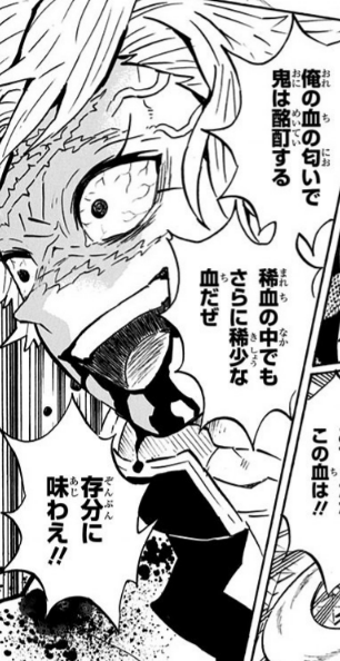俺の血の匂いで鬼は酩酊する、稀血の中でもさらに希少な血だぜ、存分に味わえ!!