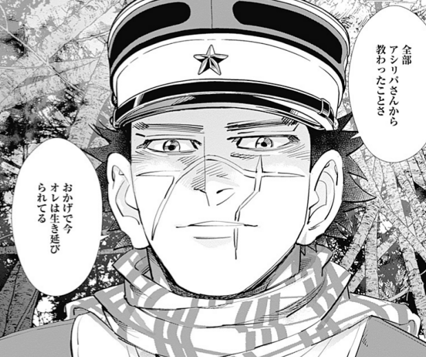 ゴールデンカムイ228話にて、逸れてしまった杉元が一人で過ごしている際に放ったセリフ。アシㇼパに教わったことで生き延びていく杉元。ストーリーの積み重ねを感じる瞬間です。