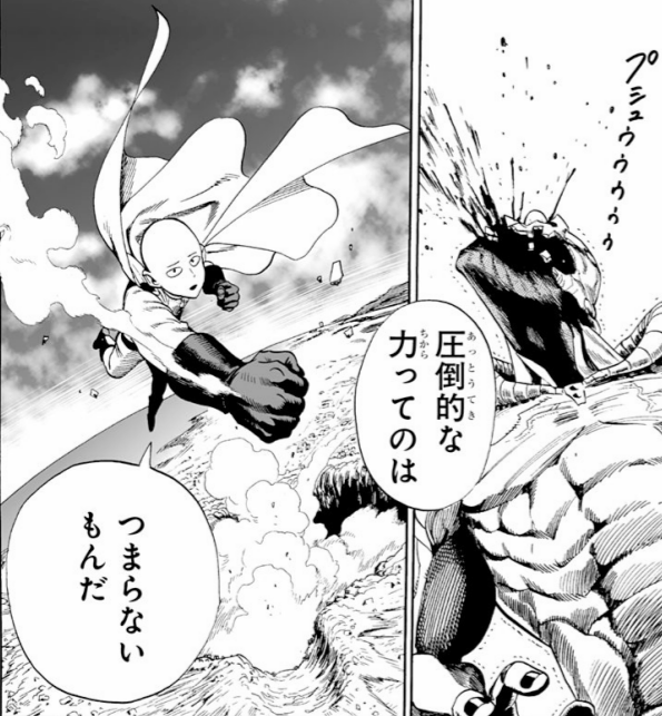 ワンパンマン3話にて、マルゴリをワンパンで沈めたサイタマが放ったセリフ。「圧倒的な力ってのはつまらないもん」というサイタマ専用のセリフ。この作品の作品性にも繋がる言葉である。