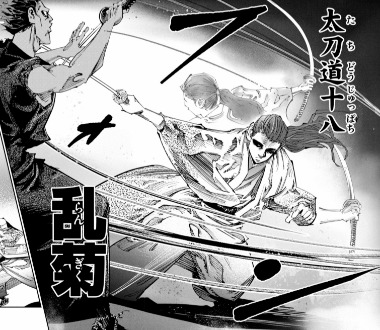 イクサガミ28話にて、菊臣が無骨に乱菊を放っていくシーン。菊臣の必殺技が描かれていくシーン。菊臣らしいスマートな剣技。