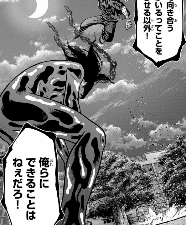 ・・・わからねぇ・・・。けど、あいつをあのままにしちゃダメだ・・・。あのままじゃ遊摺部は「死ぬ」。自分で「死ぬ」。俺も絶望を経験したからわかる・・・全部失った瞬間の感情を。妹があいつの生きる希望だったんなら、その妹がいなくなったら生きる理由がねぇんだ。なら向かう先は「自殺」しかねぇ。死にてぇやつは勝手に死ねって思うけど・・・それが身内なら話は別だ・・・。何もかも失ったと思ってるかもしんねぇ・・・!けどな!全部なくなったわけじゃねぇ!