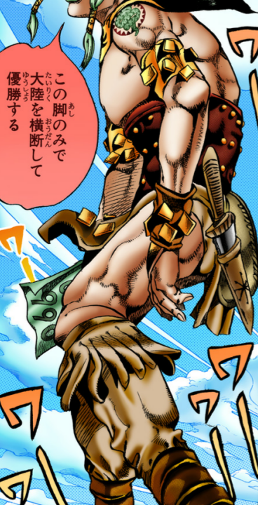 スティール・ボール・ラン4話にて、「・・・それと直前に馬の鼻紋をとる・・・」と言う受付にサンドマンが返したセリフ。まさかの自分の脚での参戦。キャラが立ちすぎてる。