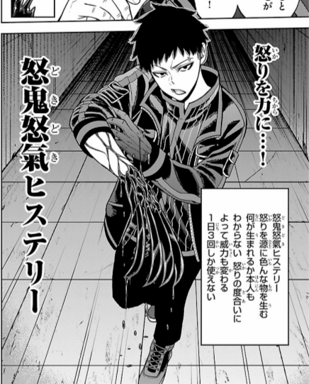 桃源暗鬼44話にて、矢颪が怒鬼怒氣ヒステリーを発動していくシーン。矢颪の能力が明らかになるシーン。能力名、はっちゃけすぎだろ。