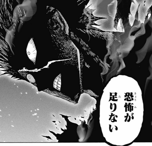 ワンパンマン94話にて、「究極生物として完成されたオロチ様と今のお前ではレベルが違い過ぎる」と言うギョロギョロにガロウが返したセリフ。「恐怖」の必要性を語るガロウ。最高に悪の顔をしてやがる。