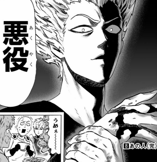 ワンパンマン番外編.2海老にて、「貴様何者だ」と聞かれた際のガロウのセリフ。「悪役」というガロウらしすぎる解答。ここからガロウの活躍が描かれていく。