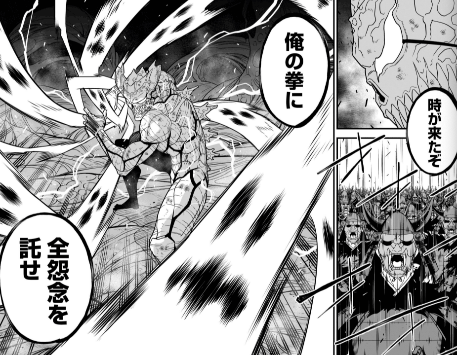 怪獣8号127話にて、明暦の大怪獣に殺された者たちの怨念を拳に載せていくカフカのセリフ。ついに明暦の大怪獣との決着を迎える時。これが怪獣8号最後にして最強の攻撃。