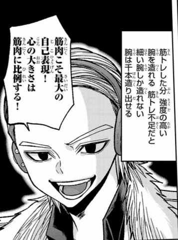 筋肉こそ最大の自己表現!心の大きさは筋肉に比例する!桃源暗鬼110話にて、筋骨千頭筋観音を繰り出した桃舵のセリフ。「心の大きさは筋肉に比例する」とかいう独自解釈。桃舵のキャラクター性が出て...