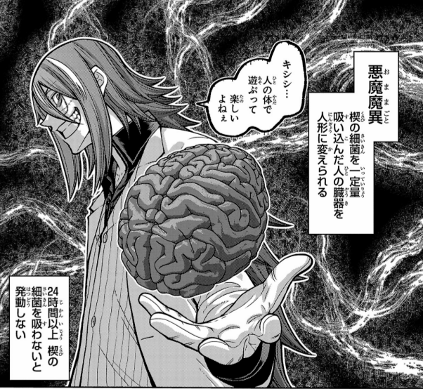 キシシ・・・人の体で遊ぶって楽しいよねぇ僕の能力はねぇ、「人の内臓を人形に変える」ことができるんだ。その内臓人形が攻撃を受けると持ち主の内臓がダメージを負う。今君が壊したのは誰...