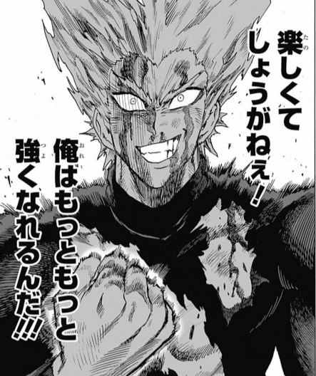 ワンパンマン77話にて、番犬マンにやられたガロウのセリフ。こっぴどくやられてもそれを楽しんでいくガロウ。サイタマと対照的な存在である。