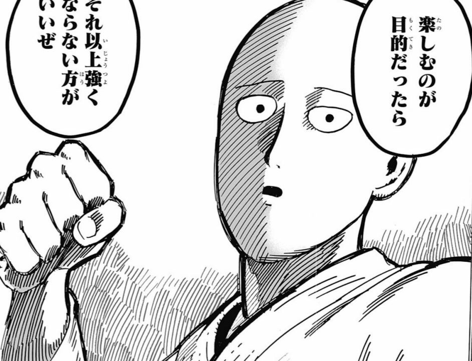 ワンパンマン70話にて、「まぁ気楽に生きてる俺からのアドバイスだと思ってよ」と言うスイリューにサイタマが返したセリフ。「強くなりすぎると楽しめなくなる」という概念。サイタマにしか言えないセリフすぎるだろ。