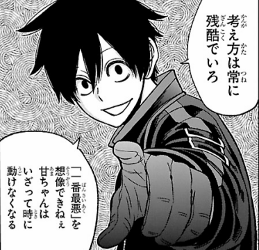 桃源暗鬼2話にて、四季の首を絞めていく無陀野のセリフ。初手から死に際まで追い詰めていくという。無駄を嫌う無陀野らしい発想。