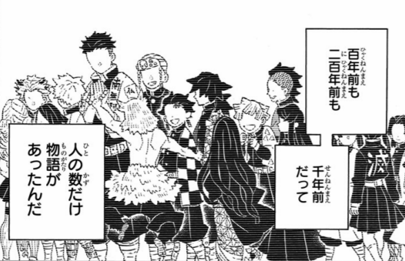 鬼滅の刃205話にて、寝てる炭彦のセリフ。「人の人生は物語」と解釈する炭彦。「人の数だけ物語があったんだ」は良いセリフだよな。