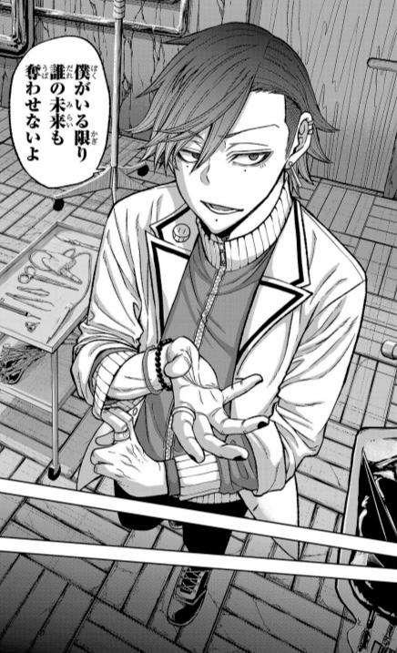 桃源暗鬼75話にて、「で?実際の用は何だ?」と言う無陀野に京夜が返したセリフ。「僕がいる限り誰の未来も奪わせない」というかっこよすぎるセリフ。救護部隊のカリスマすぎるだろ。