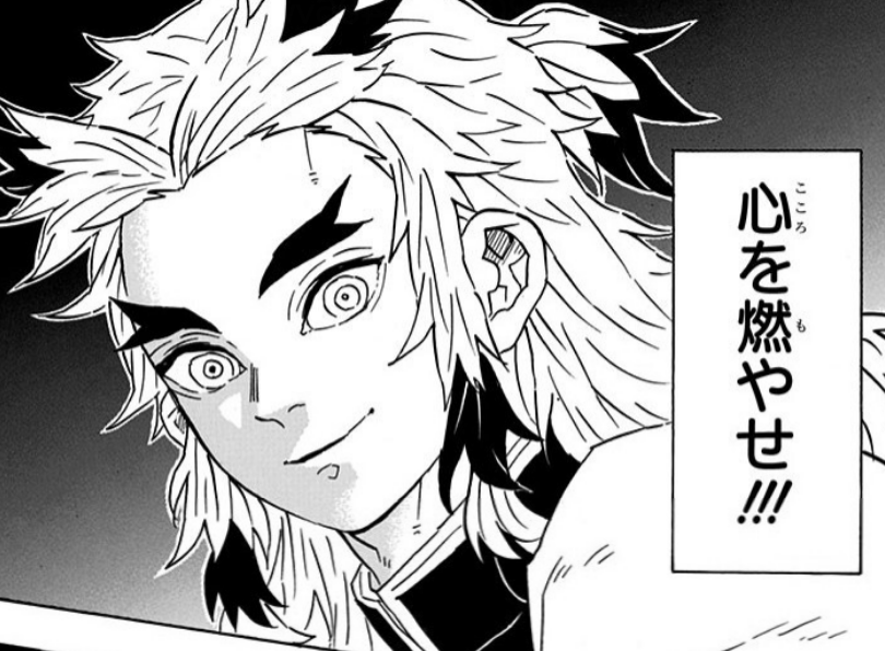 鬼滅の刃77話にて、堕姫との戦いで刀を刃毀れさせた炭治郎のセリフ。「心を燃やせ」という鬼滅の刃を代表する名セリフ。炭治郎が杏寿郎を強さの象徴としてるのがいい。