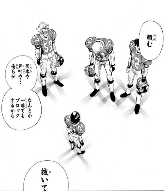 アイシールド2166話にて、「勝負所だ、壁の見せ場だぞ」と言われた際の十文字のセリフ。アイシールドに頭を下げていく十文字。十文字も熱いキャラなんだよな。