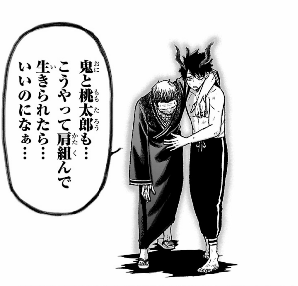 桃源暗鬼1話にて、四季に「親父と!「これから」の話がしてぇんだよ!」と言われた際の剛志のセリフ。鬼と桃太郎が共存するという叶わぬ夢を語っていく剛志。果たしてこの未来が現実となるのか。